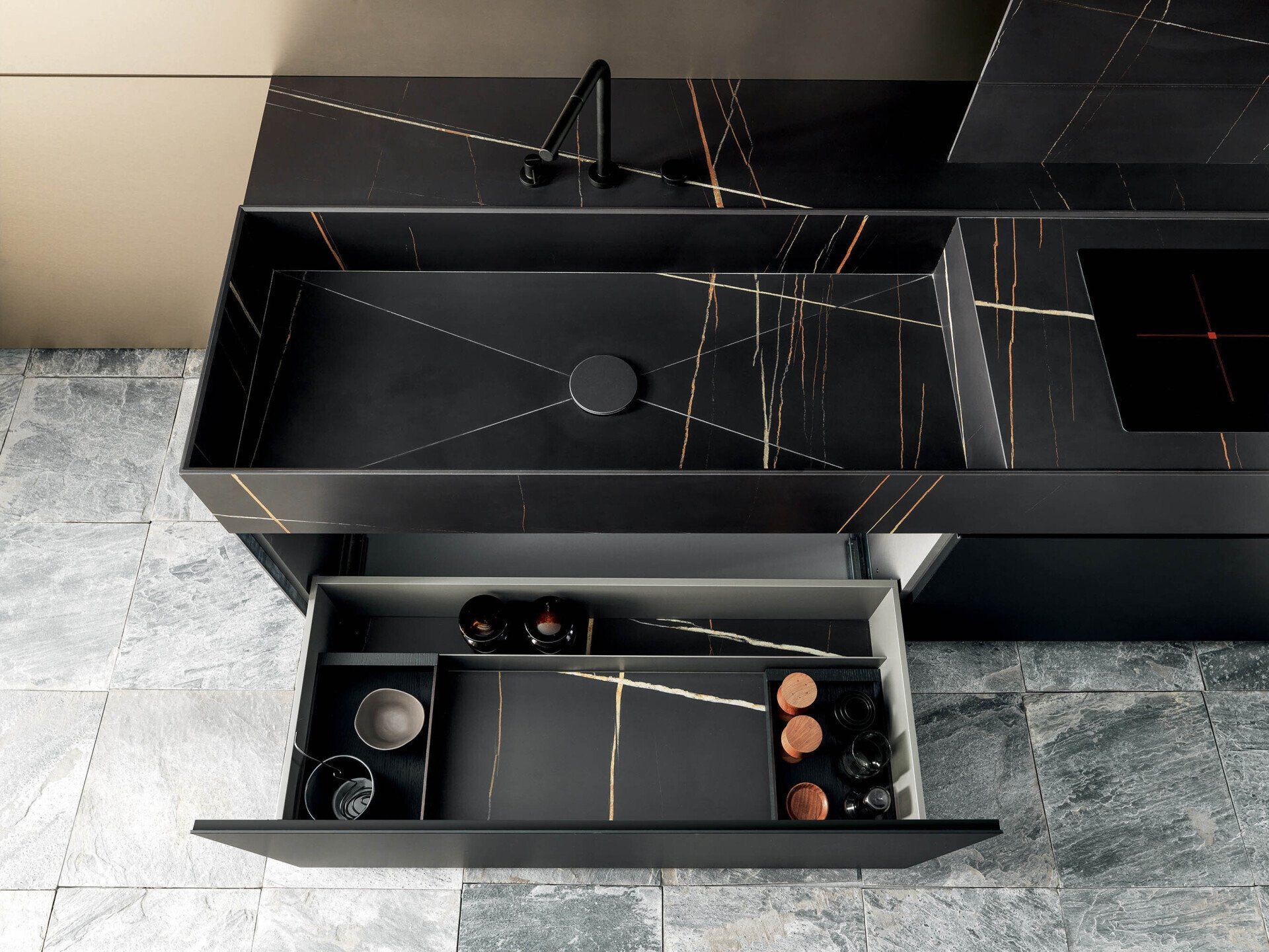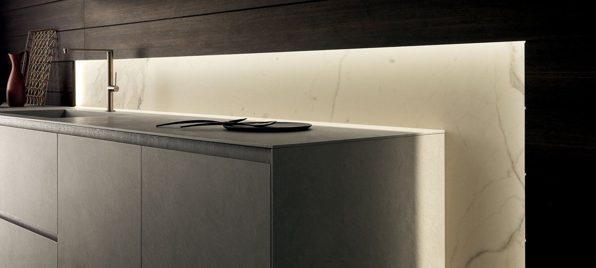 L'utilizzo di nuovi e innovativi materiali come la kerlite, la resina di cemento, la pietra, il gres, l'alluminio, offrono ulteriori spunti di progettazione, realizzando un perfetta simbiosi con laccature lucide od opache oppure legni, sottolineando così la personalità del progetto.